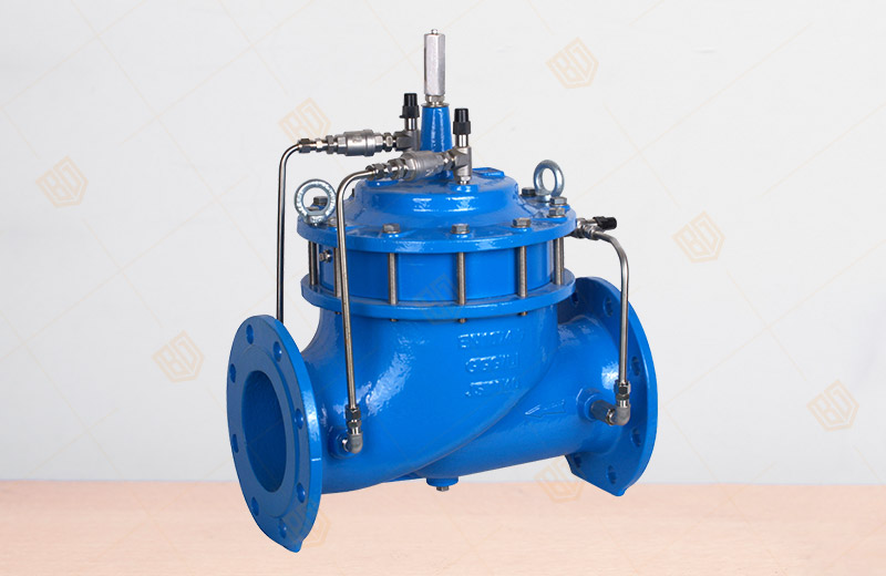 百鋼閥門集團生產銷售的700X水泵控制閥由主閥、電磁導閥、針閥、球閥、單向閥、行程開關、微形過濾器和壓力表組成水力控制接管系統。水泵需停止工作時,先由進口壓使主閥關閉90%后,水泵停止運轉。剩余10%由回水關閉。可防止水錘現象發生。